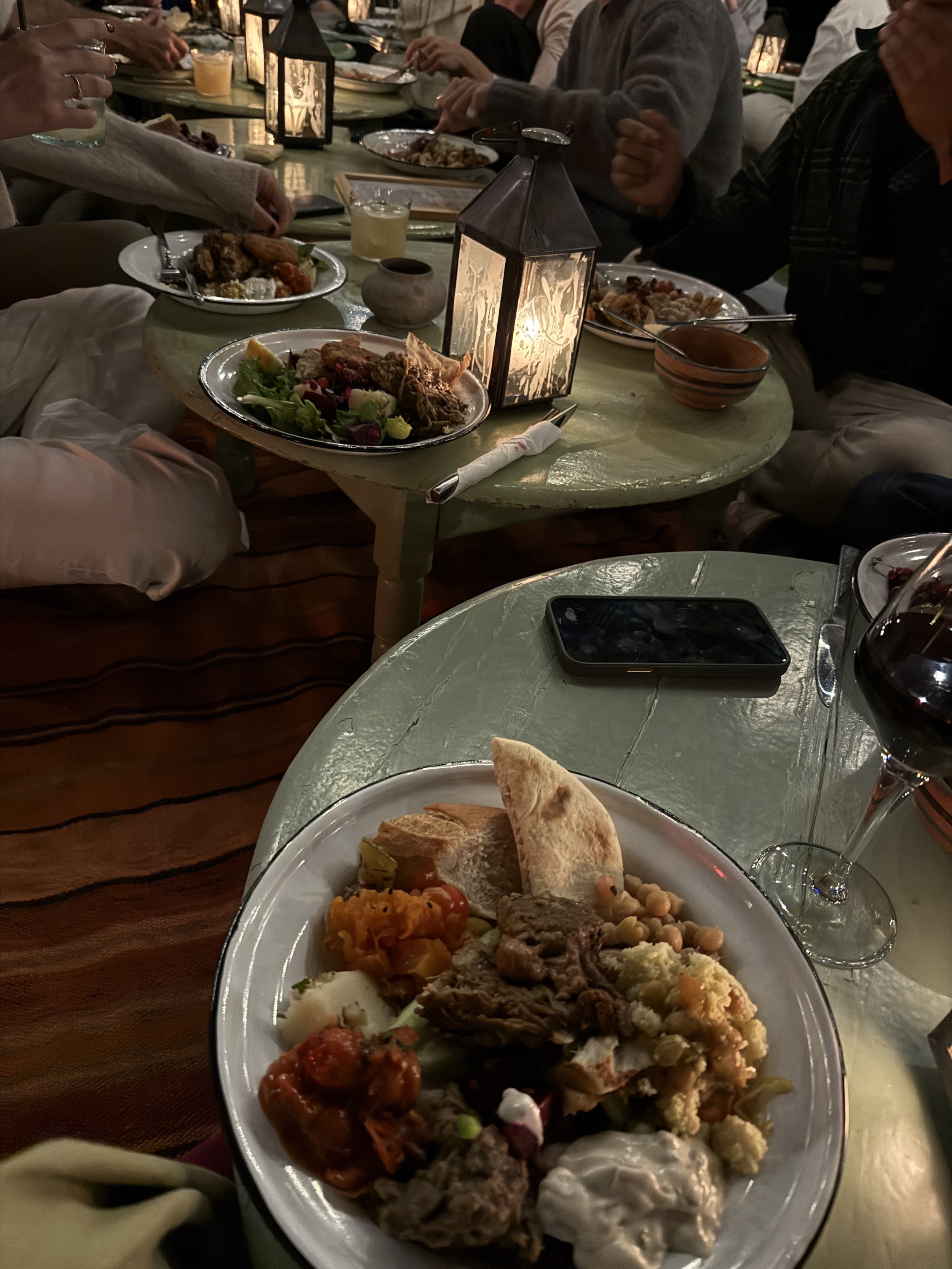 Family-style feast at Amouage by Surf Maroc, included in the surf coaching package and a great way to make new friends